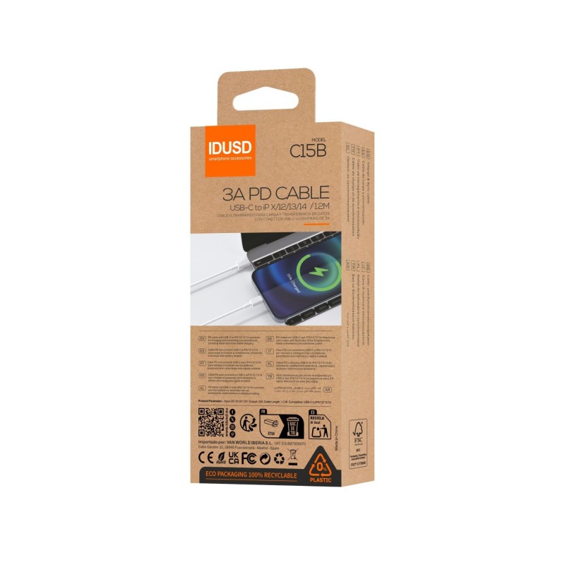 O Eco Cabo USB-C para Lightning PD 1.2M 3A - C15B é um cabo de carregamento rápido projetado para dispositivos Apple, incluindo iPhone X, 12, 13 e 14. Com 1,2 metros de comprimento e fabricado em PVC durável, este cabo oferece uma saída de até 3A para um carregamento eficiente. Além disso, vem em uma embalagem certificada pelo FSC, destacando nosso compromisso com a sustentabilidade ambiental e qualidade garantida.
