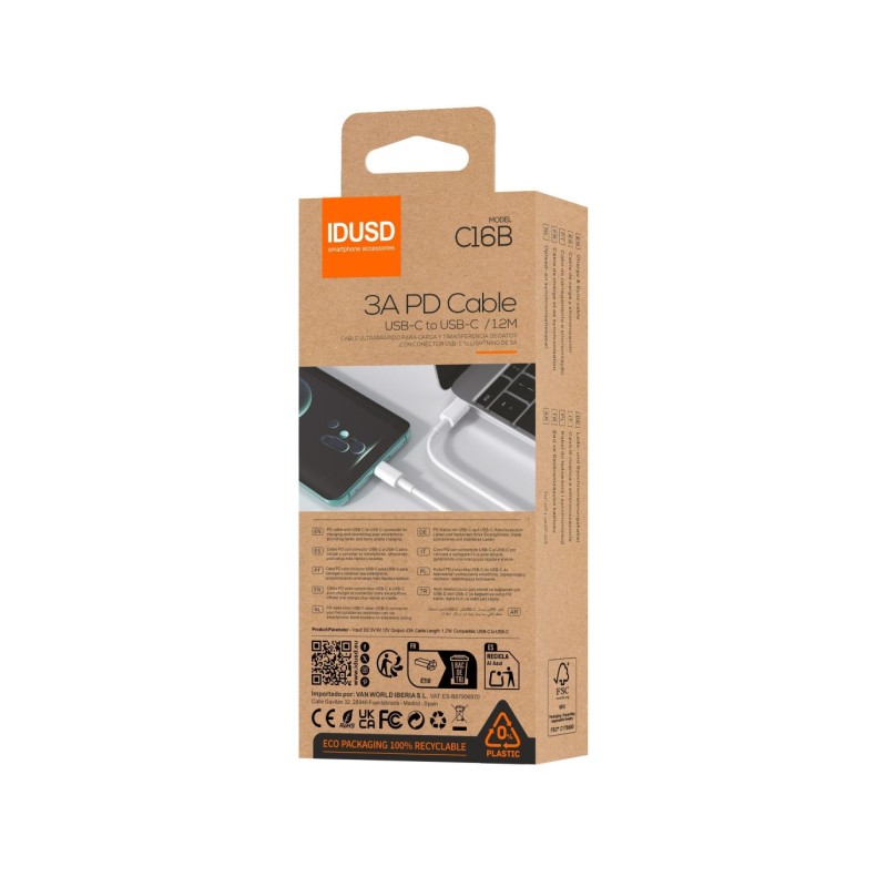 O Eco Cabo USB-C para USB-C 1.2M 3A - C16B é um cabo de carregamento rápido projetado para uma ampla variedade de dispositivos, incluindo smartphones e tablets Android com conector USB-C, iPhone séries 15 e 16 e iPads com porta USB-C. Com 1,2 metros de comprimento e fabricado em PVC resistente, este cabo oferece uma saída de até 3A para um carregamento eficiente. Além disso, vem em uma embalagem certificada pelo FSC, destacando nosso compromisso com a sustentabilidade ambiental e a qualidade garantida.