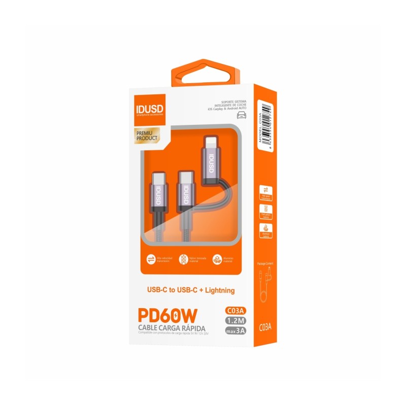 O Cabo de Nylon de Alumínio 2 em 1 oferece carregamento rápido, compatibilidade universal e um design resistente. Com até 60W de potência, é ideal para dispositivos com portas USB-C e Lightning, compatível com CarPlay e Android Auto, perfeito para uso diário.
