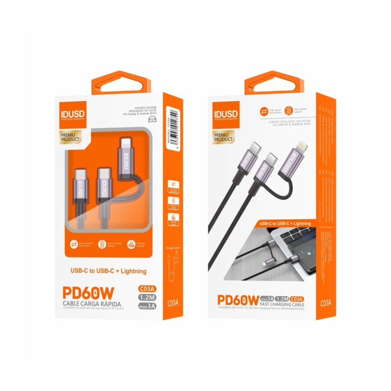 Cabo de Nylon de Alumínio 2 em 1 oferece carregamento rápido, compatibilidade universal e um design resistente. Com até 60W de potência, é ideal para dispositivos com portas USB-C e Lightning, compatível com CarPlay e Android Auto, perfeito para uso diário.