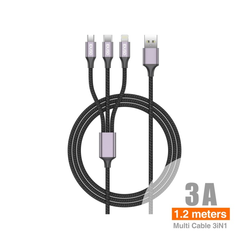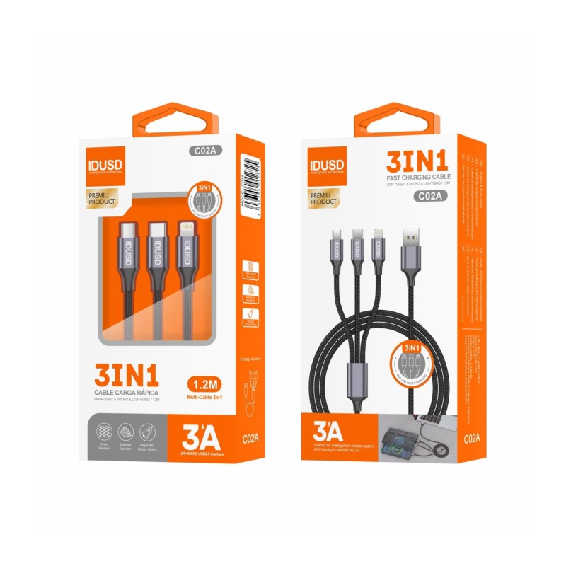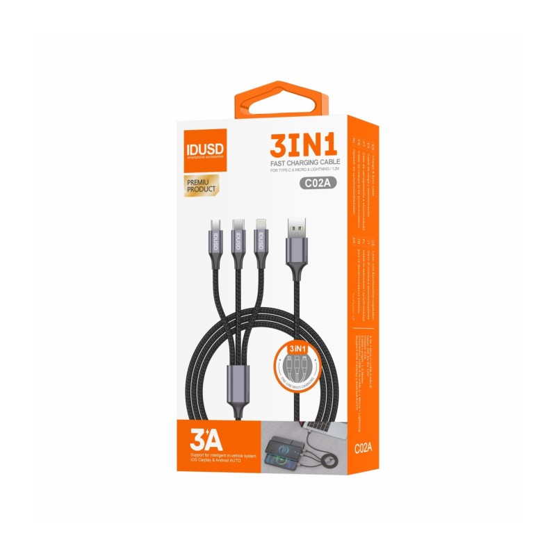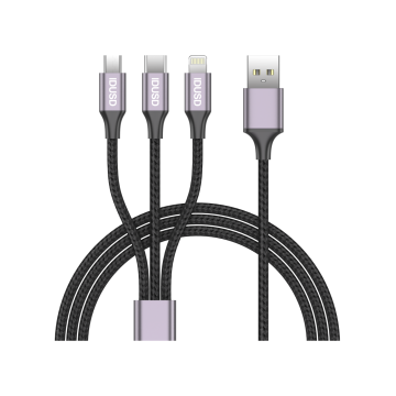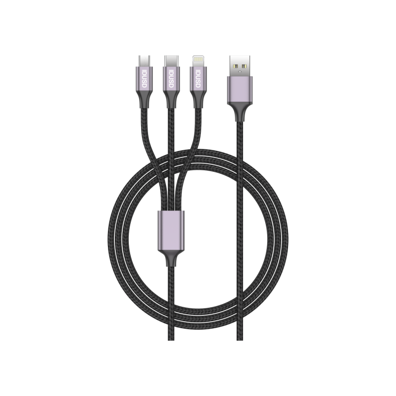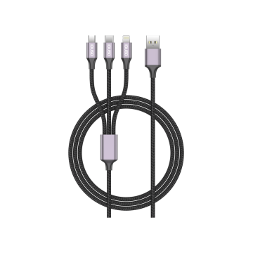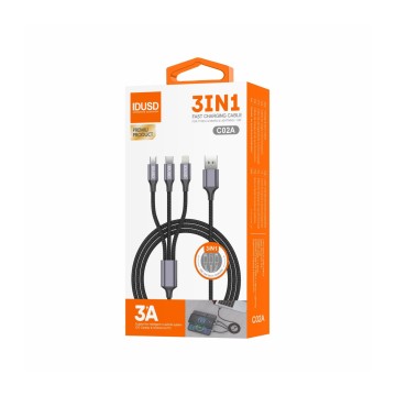 O Cabo de Nylon 3 em 1 é a solução perfeita para carregar e transferir dados entre dispositivos com portas USB-C, Micro USB e Lightning. Com alta velocidade, design durável e carregamento seguro, é um acessório essencial para o dia a dia.