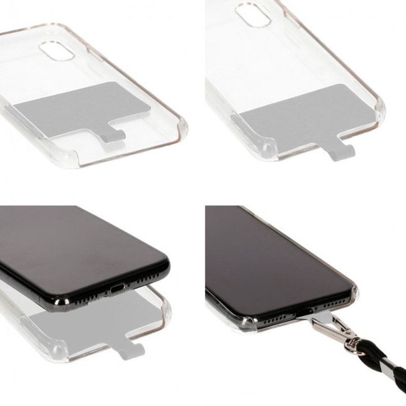 Com um sistema de fixação através de um cartão de plástico (incluído) que se insere na caixa ou estojo do smartphone, de onde sai uma peça de plástico à qual se fixa o cordão.