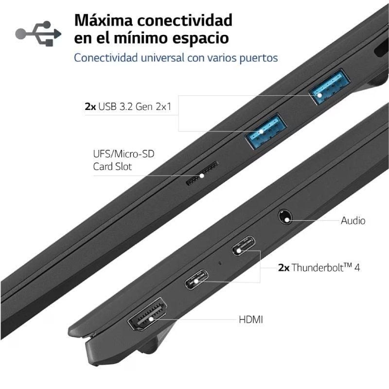 O LG gram oferece não apenas várias portas, mas também duas portas Thunderbolt™ 4 para máxima escalabilidade. Desfrute de uma tela 5K com velocidades de transferência de 40 GB enquanto carrega dispositivos externos simultaneamente.