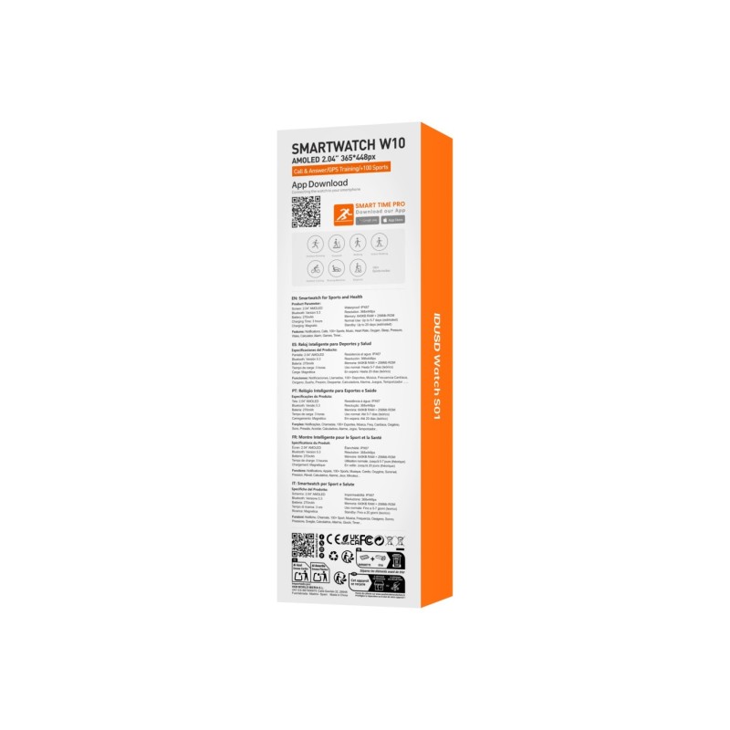 O smartwatch sincroniza com o aplicativo SMARTTIME Pro, permitindo visualizar detalhadamente seus dados de saúde e esportes. Além disso, conta com múltiplos idiomas, histórico de dados, personalização de notificações e definição de metas.