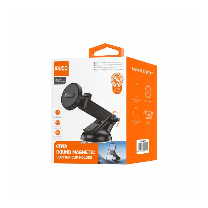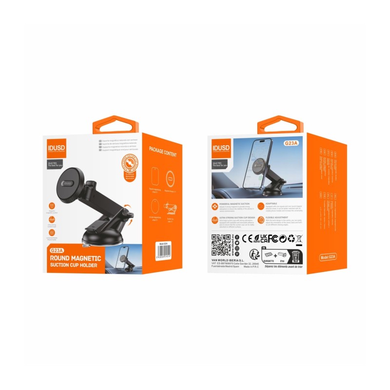 O Suporte Carro com Ventosa Magnética G23A oferece uma sujecção ultraforte e estável graças às suas ventosas de grande potência e quatro ímãs internos. Compatível com todos os modelos de smartphones (3,5" a 6,5"), este suporte proporciona uma experiência de uso confortável e versátil, permitindo ajustar a posição do telefone conforme suas necessidades, mesmo em condições de condução difíceis.