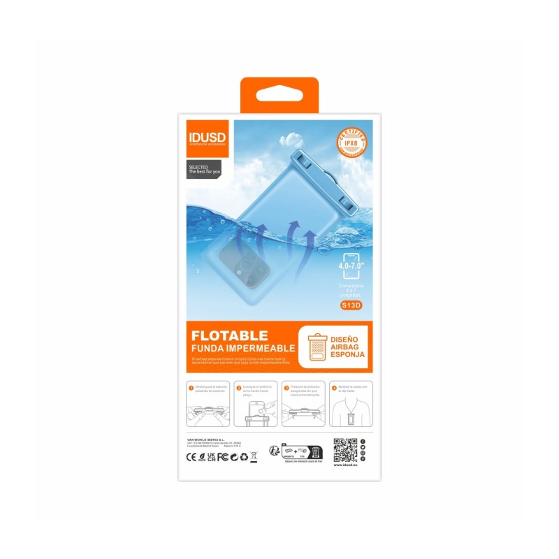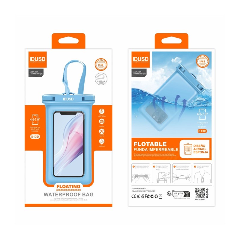 Explore e desfrute de atividades aquáticas com total confiança usando a nossa Capa Praia PVC Flutuante Azul - S13D. Projetada para dispositivos móveis de 4 a 7 polegadas, esta capa oferece proteção superior contra água, choques e quedas graças ao seu material robusto de PVC e ao design interno com airbag de esponja que garante que o seu telemóvel flutue na água. Perfeita para qualquer aventura aquática, a capa mantém o seu dispositivo seguro e seco, permitindo que você o use normalmente devido ao material de alta sensibilidade ao toque.